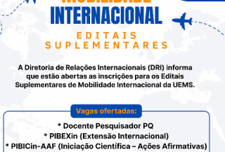A UEMS (Universidade Estadual de Mato Grosso do Sul), por meio da DRI (Diretoria de Relações Internacionais), está com inscrições abertas para os Editais Suplementares de Mobilidade Internacional, amp...
