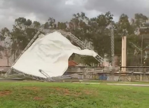 Estrutura foi arrastada com a força do vento forte (Vídeo: Direto Das Ruas) Vendaval que atingiu Naviraí na tarde desta terça-feira (4/11), causou estragos no parque de exposições, onde eram monrad...